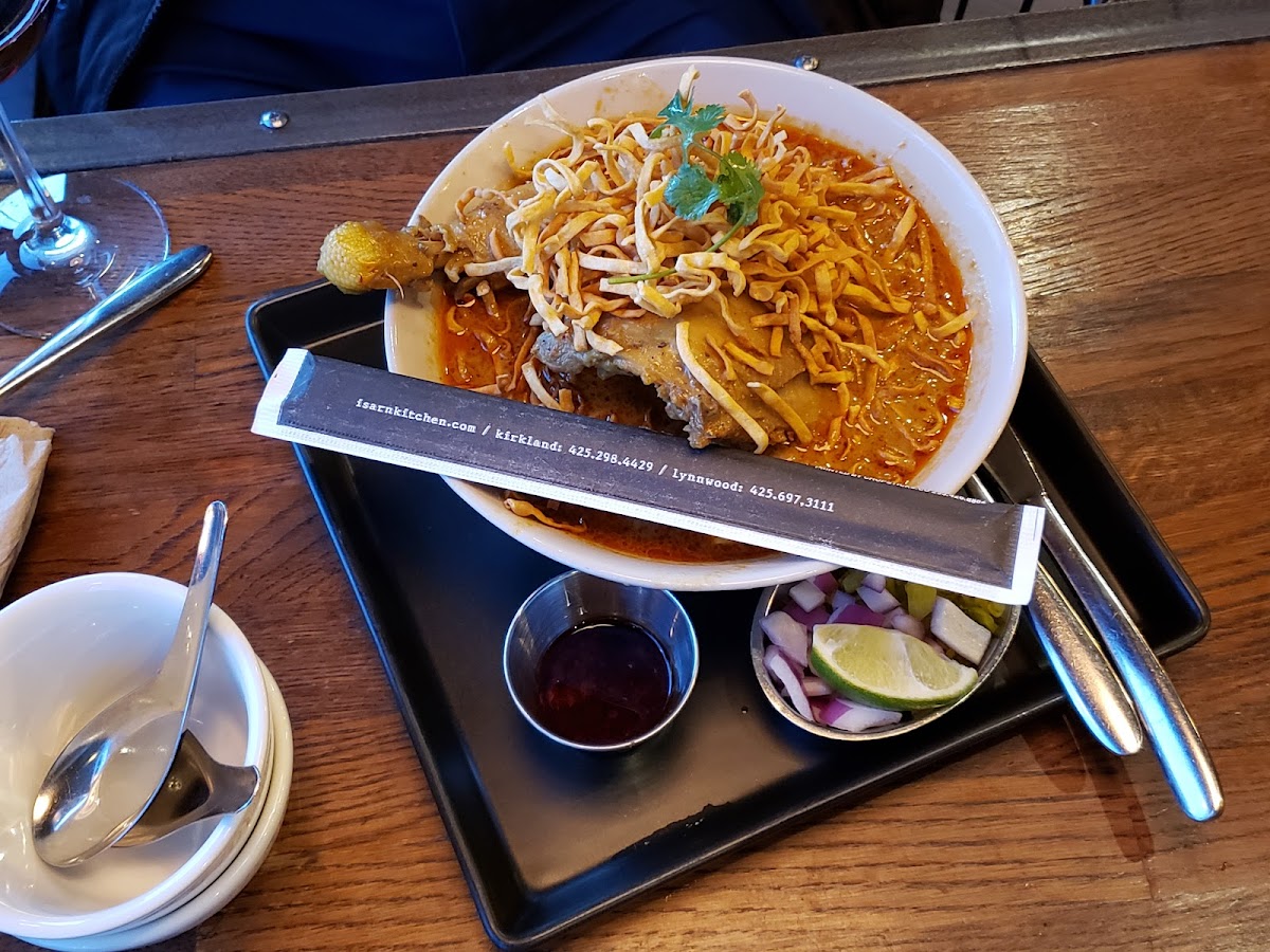 Isarn is always a solid spot for Thai food. I came here with a group of around 8 people for a late lunch/early dinner on Saturday afternoon. The restaurant was still pretty busy despite it being off hours, but we were able to be seated immediately. I got the khao soi, and the taste and quality of the dish was consistent with the Kirkland location which I usually go to. Service was friendly, and they even dealt with us splitting the bill individually among 8 people at the end. Would recommend if you're looking for a Thai spot in the area!